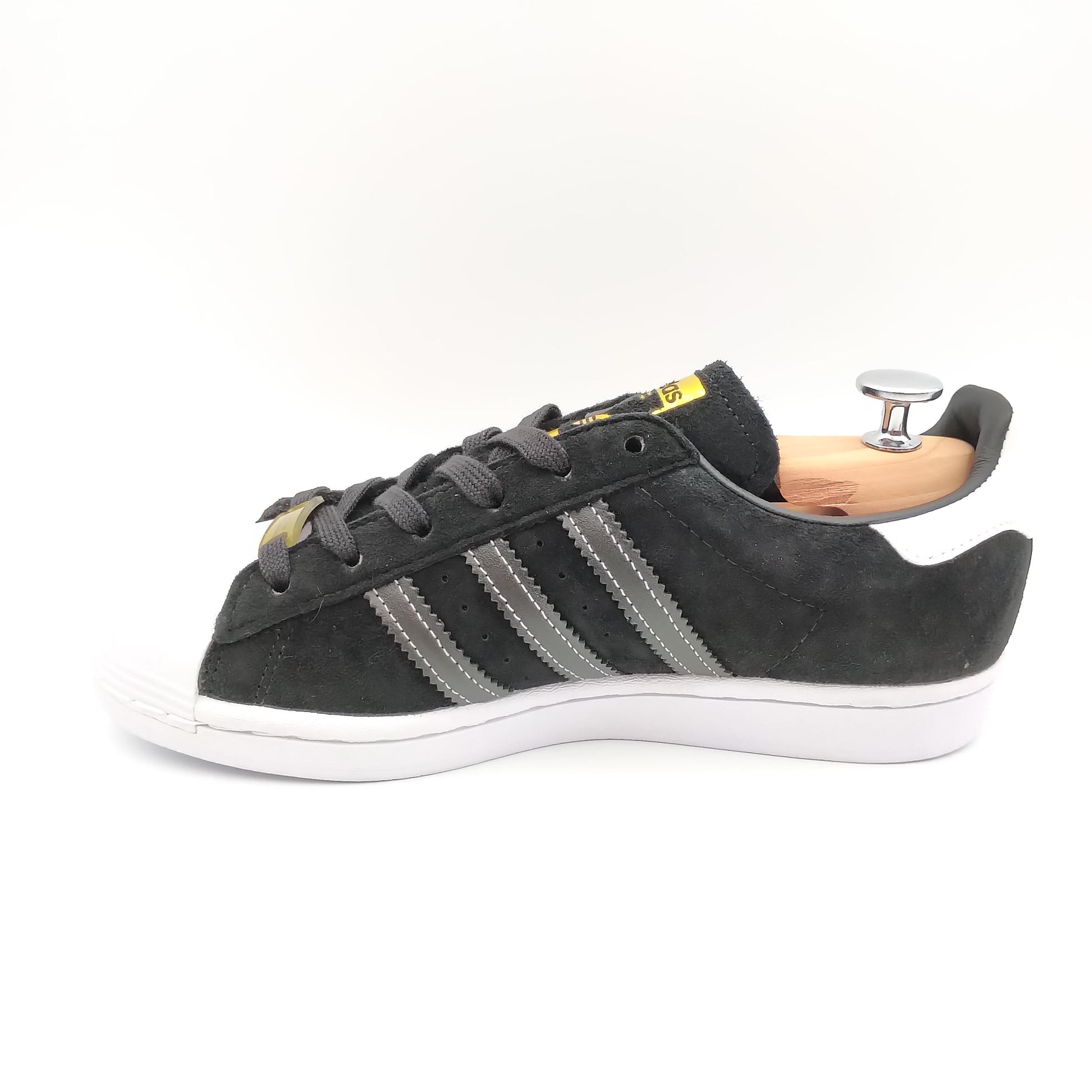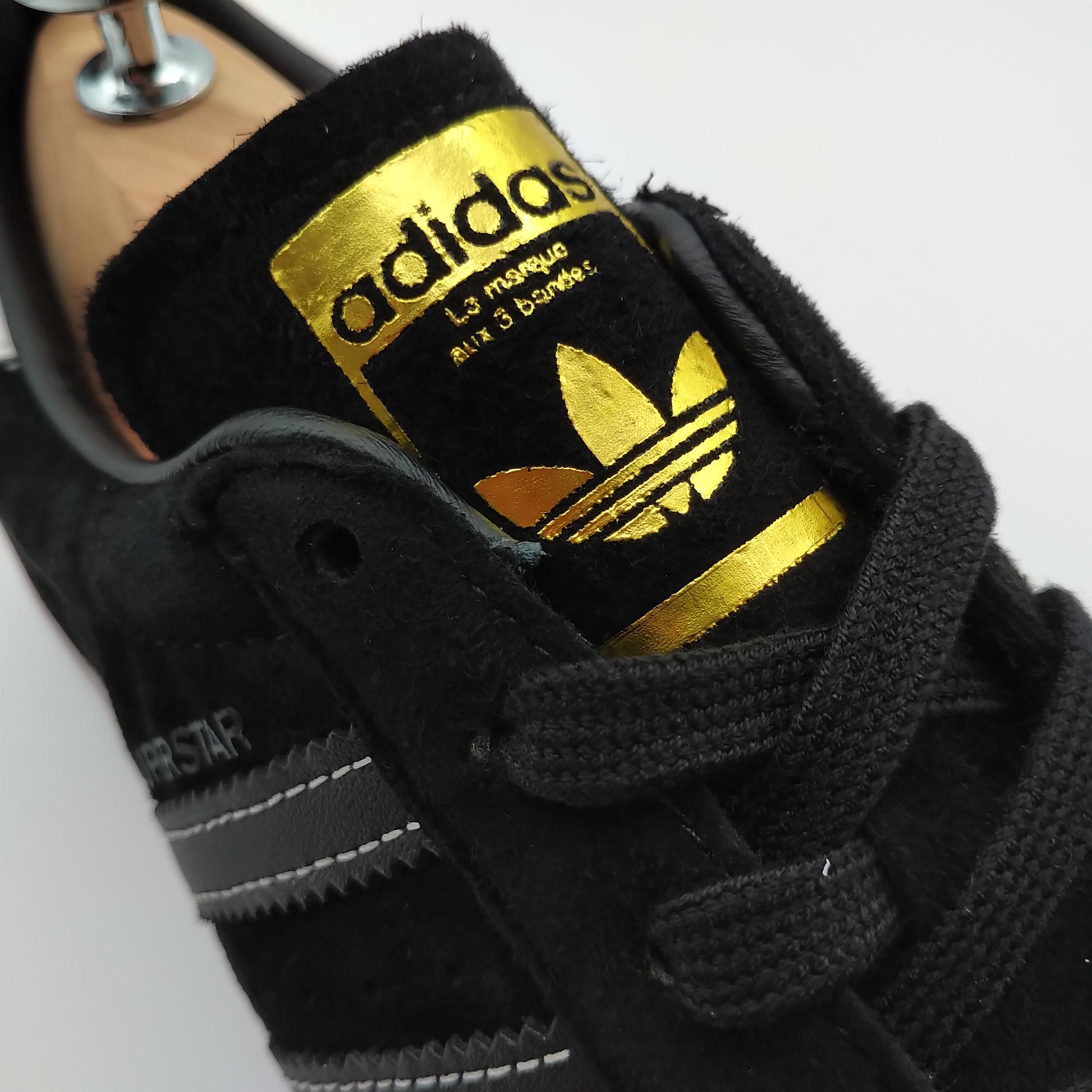 Le modèle Adidas Superstar débute sa carrière dans les années 1970 avec la NBA aux États-Unis, elle fut ensuite adoptée et démocratisée par le milieu Hip-Hop et depuis la référence mondiale de la paire de baskets tendance est toujours d'actualité. Ce modèle est noir avec les 3 bandes grises et des motifs dorés.